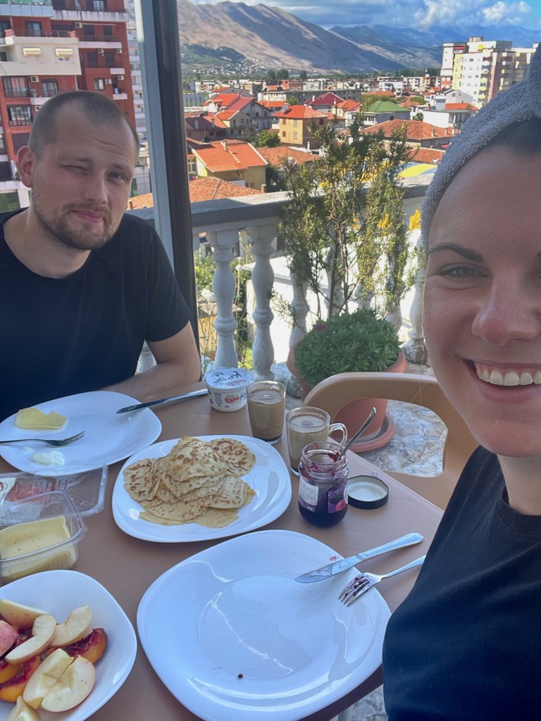 Atbraucot uz Škodru mūs sagaidīja smaidīgā Lola (interesants vārds kaut kad sen runājām, ka šis vārds ir izteikts striptīzdejotājas vārds, taču ir arī sievietes gados ar šādu vārdu), kas bija dzīvokļa īpašniece un pacienāja ar aukstu persiku sulu, kas likās kā svētlaime. Laikam jau viņi zina, ko kāro tūristi, kas nobraukuši pietiekami daudz kilometrus starppilsētu autobusā. Dzīvoklis bija ļoti mājīgs un tajā bija patīkami uzturēties. Odziņa visam bija fantastiskā terase, uz kuras varēja baudīt brokastis un ik pa laikam klausīties musulmaņu lūgšanas no netālās mošejas. Jā, Albānijā ir liels īpatsvars musulmaņu.