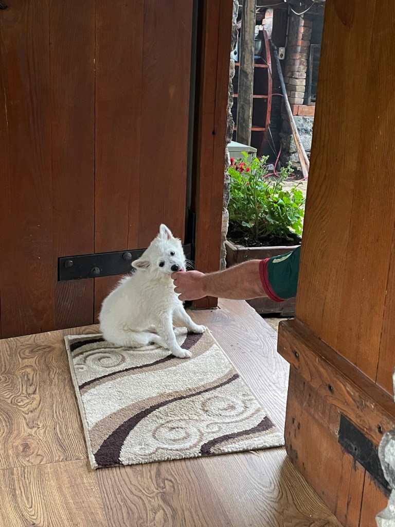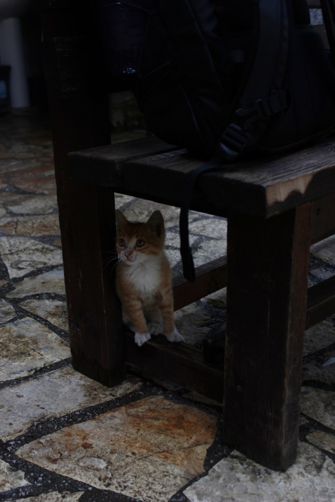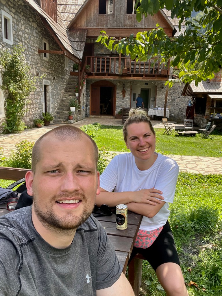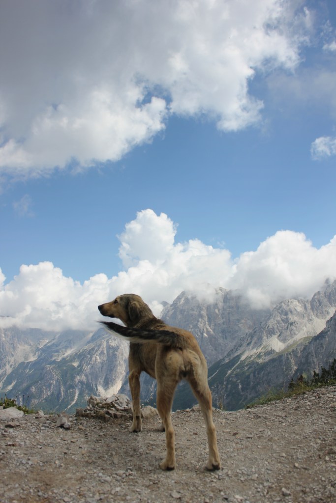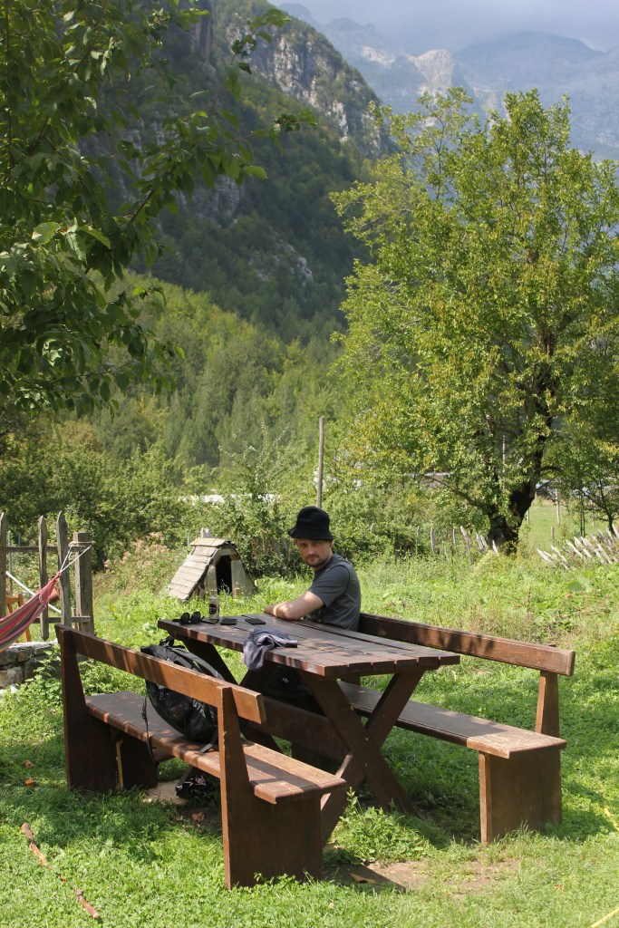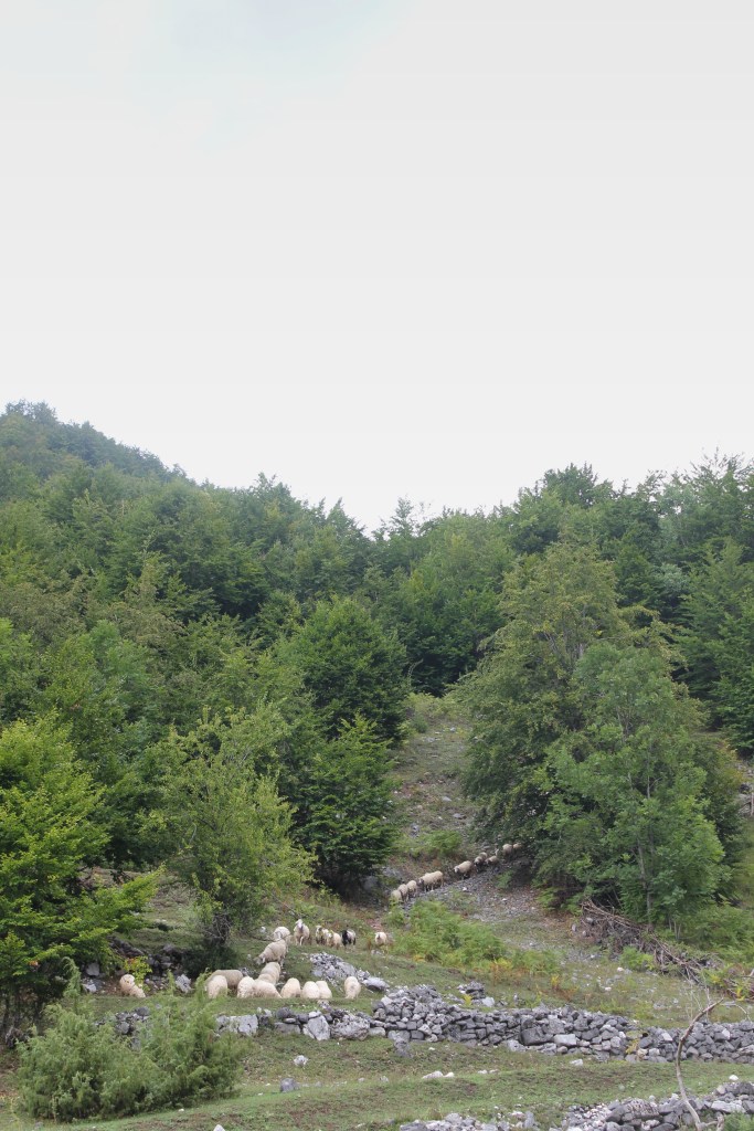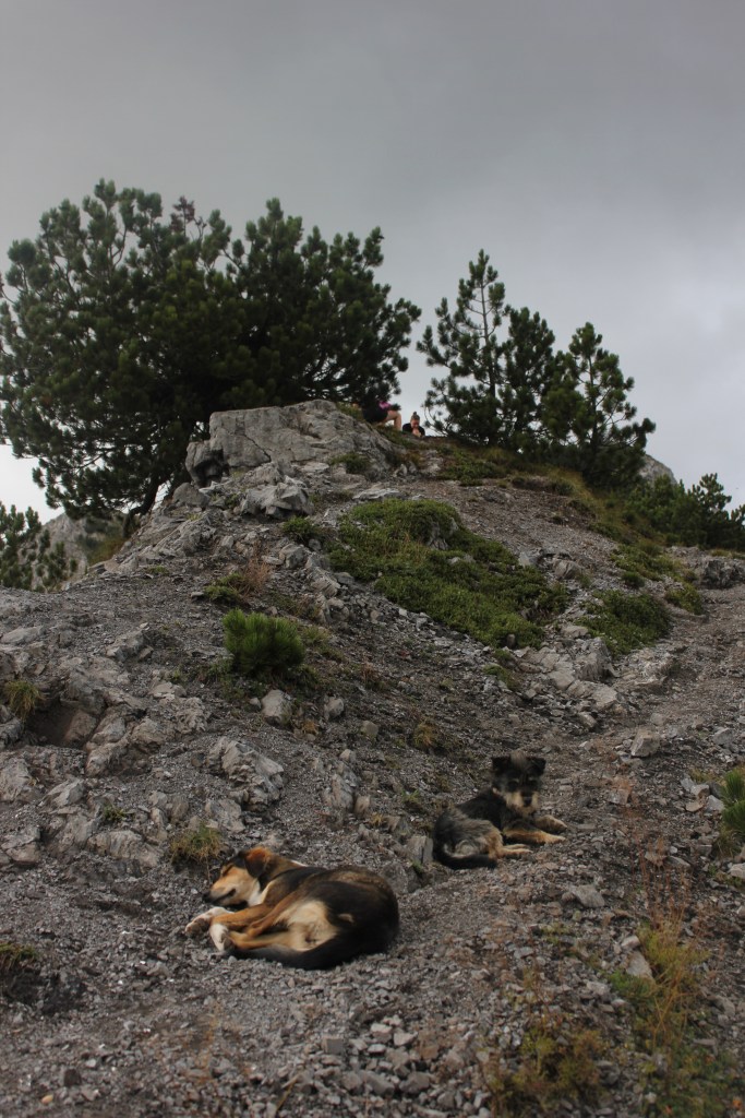 Pēc šīs filozofiskās nots, turpinām kāpienu lejā, kur bildējot aitas satikām niknu to sargu, kas sāka riet uz mums ne pa jokam un sapratām, ka labi ātri jāpazūd. Tuvojoties finišam, kas patiesībā bija vēl 1h gājiens, bet nu pa parastu, līdzenu akmeņu ceļu, sāka smidzināt lietus, piesēdām uz soliņa un tad jau sāka līt pamatīgi un mūs paaicināja vācu pāris zem sava kempera nojumes, kas bija kā dāvana, jo apkārt jau ilgu laiku nebija neviena cilvēka. Iepazināmies ar viņiem un viņu suni, kam ļoti garšoja mans pret iedeguma krēms uz kājām. Uzcienāja ar gardu kafiju un vafelēm. Papļāpājām gandrīz stundu gan par to, ka viņu izvēle krita par Balkānu apskati, taču otrajā vietā palika Baltijas valstis, un par piedzīvoto Albānijā kopumā. Lietus pārgāja un gājām tālāk. Mērķis bija skaidrs, viesnīca un apavu novilkšana.
