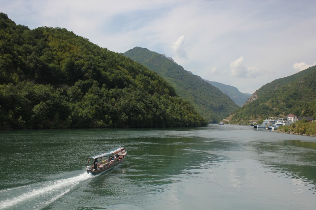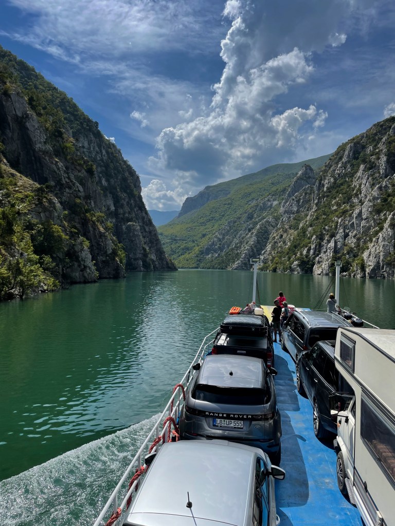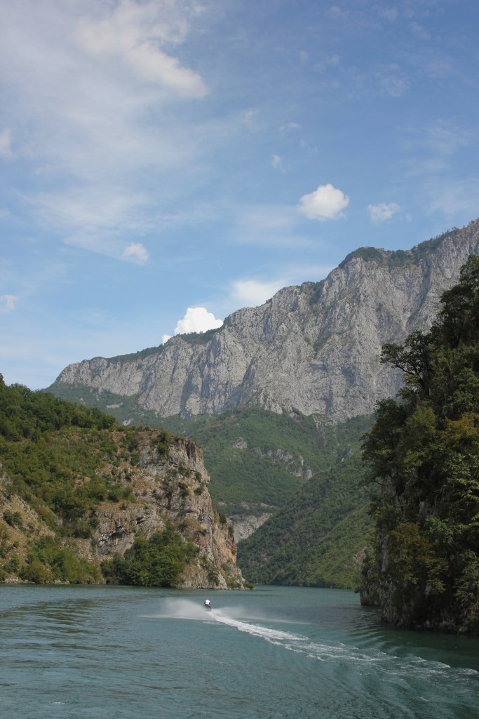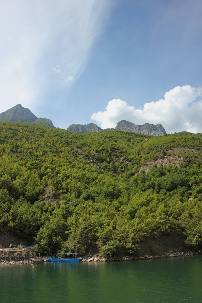 Tālāk pārsēdāmies uz prāmi un 2,5 h kuģojām pa Komani ezeru, kas vairāk līdzinājās nebeidzamai upei. Skati pa ceļam nedaudz atgādināja Norvēģijas fjordus vai Taizemes slaveno pludmali.