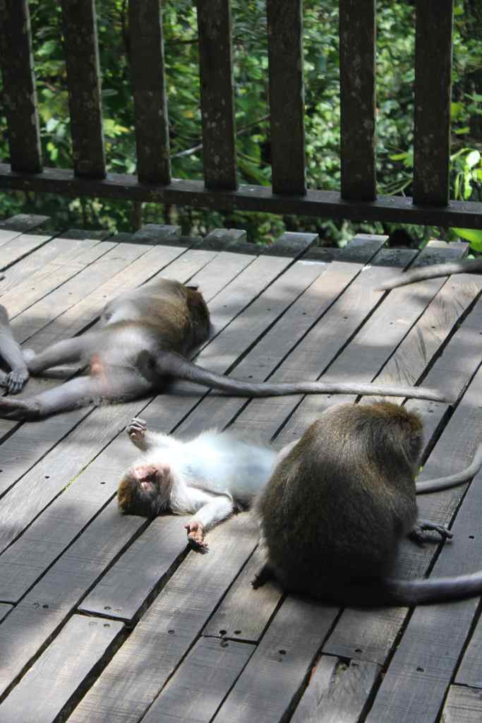 Bijām vienā no mērkaķu mežiem. Mums ļoti patika, laba vieta, kur pastaigāties. Likās, ka būs ļoti jāuzmanās no mērkaķiem, bet izrādījās, ka tā viņiem bija tāda atpūtas diena, neviens negribēja mums neko atņemt. Redzējām visu sākot no pilnīgas mērkaķu čilošanas līdz spēlēm ar kautiņiem. Cik gan tie mazie mērkaķi ir mums līdzīgi vai arī mēs līdzīgi viņiem. Visas grimases un izdarības, bija jautri uz viņiem skatīties. 😀